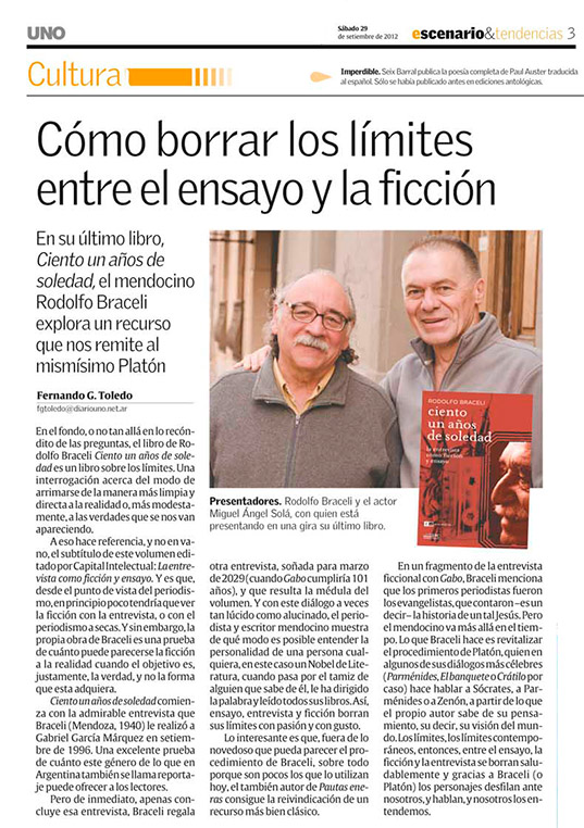 pero pienso y siento que a la corta o a la larga la entrevista ficcionada (ensayo emergente) puede llegar a tener la consistencia de un género literario. Por ahí, en esa dirección rumbee, cuando escribí Ciento un años de soledad. En ese texto la entrevista encubierta propone otra vuelta de tuerca: la de la entrevista-ficción. Aquí la desarrollé a través del encuentro ilusorio con García Márquez, en el marzo del 2029.